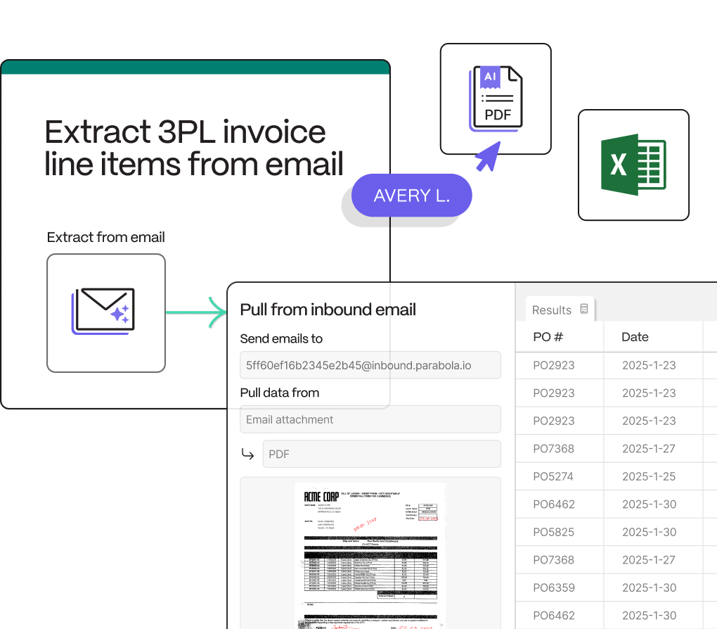 - Ops and finance teams use Parabola to automate email ingestion, invoice digitization, packing list processing, customs documentation, and document-driven reconciliation workflows.